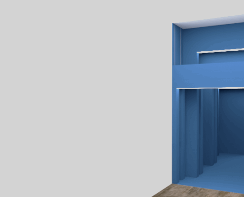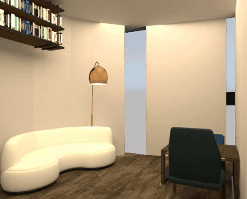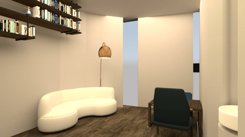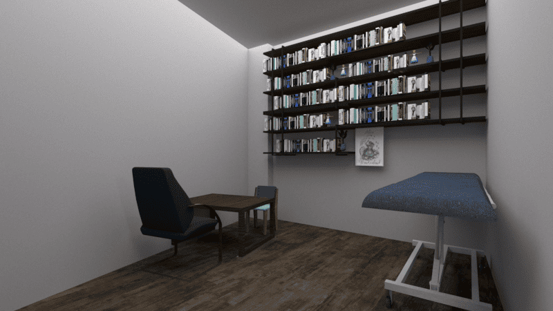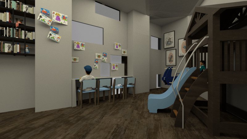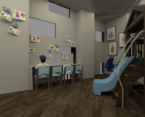 La recepción conecta con una sala de espera tradicional y otra “de las maravillas”, donde los niños pueden jugar. Después, un túnel de arcos azules los guía hacia pediatría y las consultas de logopedia, psicología y fisioterapia.
